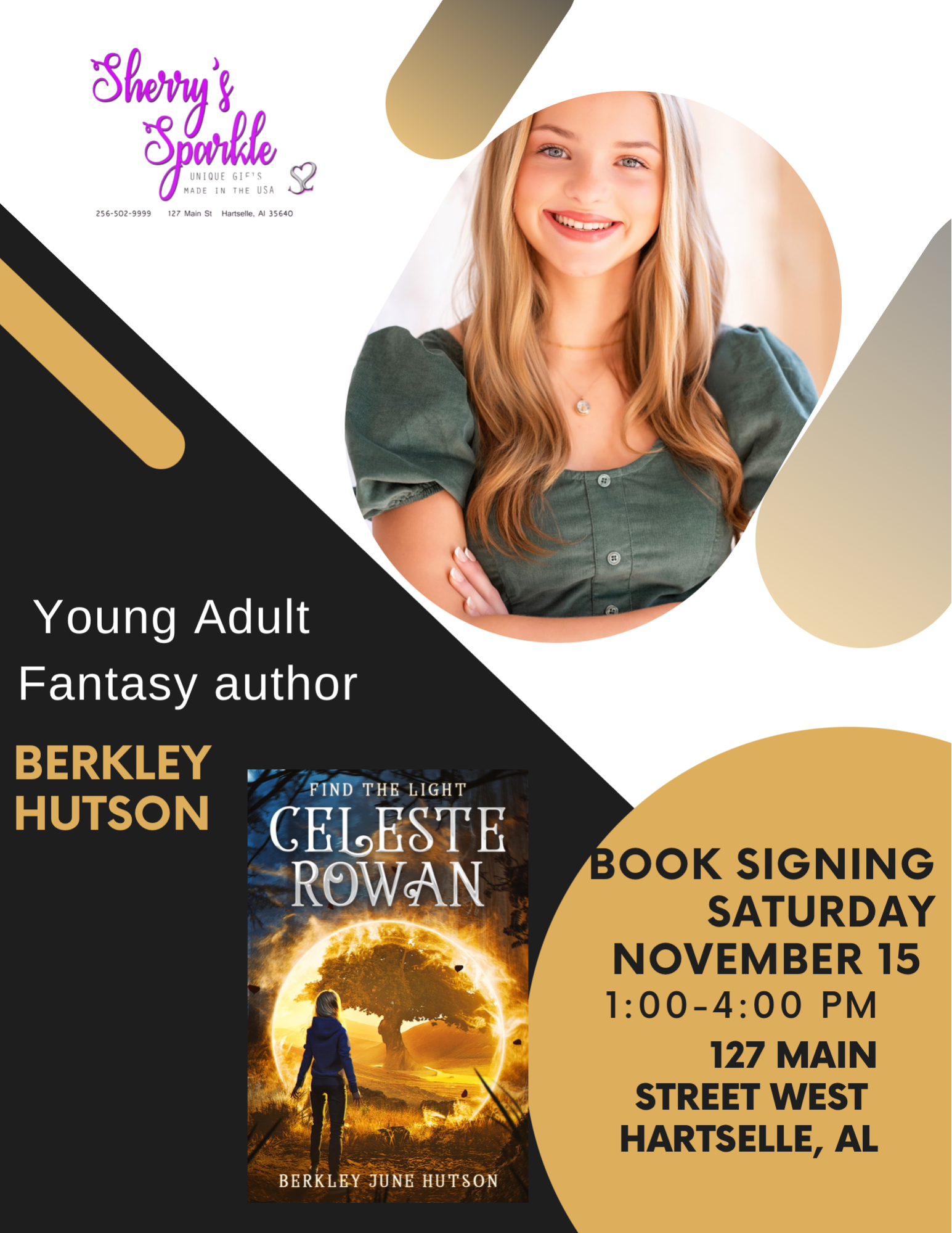 Book Signing Saturday with Berkley Hutson YA Author Berkley Hutson is the author of the Celeste Rowan Series. At fourteen, she published her first novel, Celeste Rowan: Find the Light. She realized her passion for writing in sixth grade when she began writing Celeste Rowan: Find the Light, she has fallen in love with writing ever since. She lives with her family in Alabama. She enjoys volleyball, music, reding, and an embarrassing amount of hot tea in her free time. About the book: Fourteen-year-old Celeste Rowan wants answers about her estranged father, who left when she was just a baby. However Celeste gets more than she bargained for, when a mysterious stranger in blue portals her away to another dimension-her father's dimension-where she learns she isn't what she thought she was. She has magical powers and a destiny to fulfill but does she really want that destiny? When an ancient darkness rises, threatening the world, and taking Celeste's parents captive, Celeste must decide if she has the power-and the will-to face what's coming.